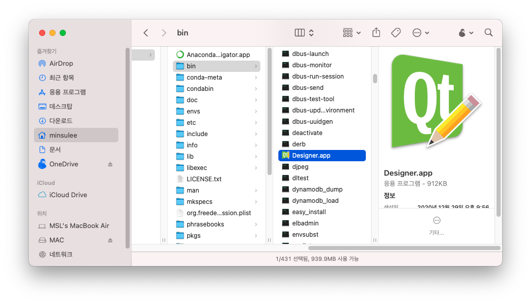 bin 폴더로 들어가보면 "Designer.app"이 존재한다. 매번 이렇게 들어가서 실행시켜도 되지만 귀찮으니 필자는 응용 프로그램으로 복사해주었다.