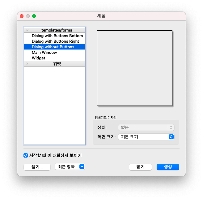 QT Designer를 실행하면 새 폼을 선택하는 창이 가장 먼저 나온다. 우선 Dialog without Buttons로 진행해 보겠다.