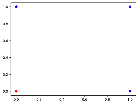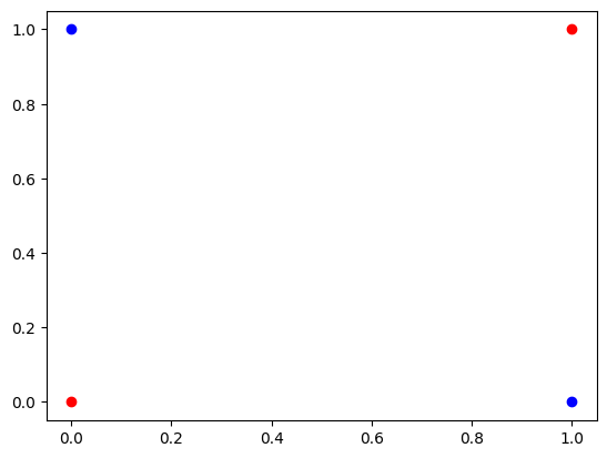 위 두 이미지에서 파란점과 빨간점을 구분하는 직선은 그리 어렵지 않게 설정할 수 있다. 그러나 아래 이미지는 퍼셉트론을 이용해서 풀 수 없다. 하나의 직선으로 아래 이미지에서 파란점과 빨간점을 구분하는 것을 불가하다.